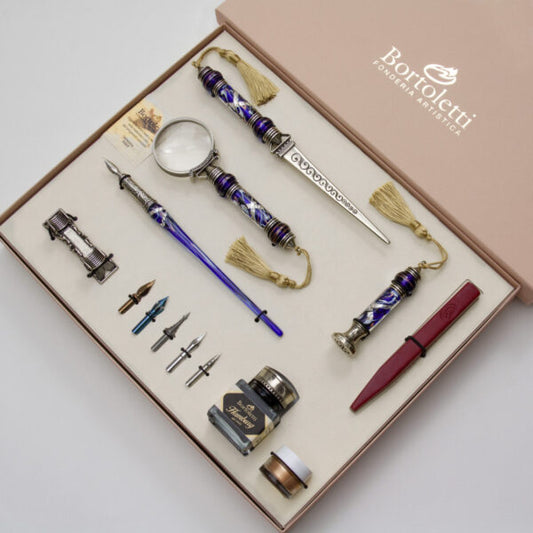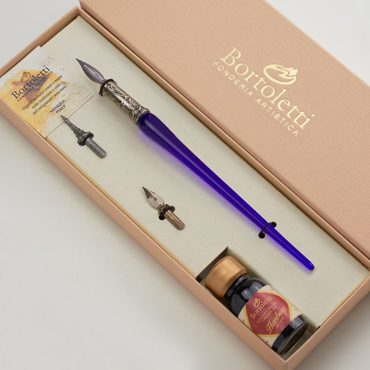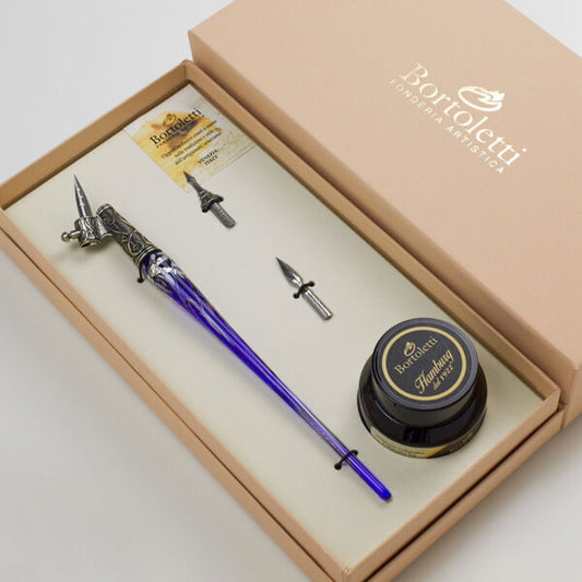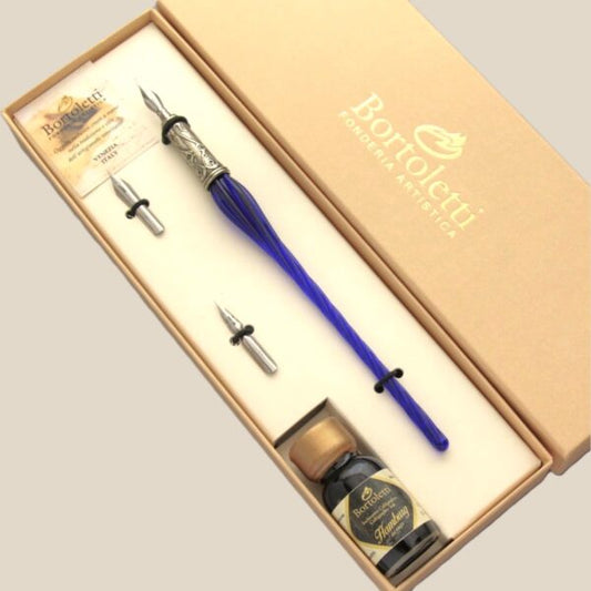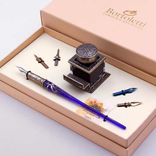 Con penna e calamaio potrai dedicarti alla pratica della bella calligrafia, un piacere che appartiene all’uomo da millenni. Collezione di penne per calligrafica in vetro di murano con porta pennino in bronzo bianco perfettamente bilanciate e pennini d’epoca originali. Ogni set di calligrafia è intimamente legato al luogo da cui proviene e alle sue tradizioni. La collezione di penne calligrafiche è stata realizzata nel laboratorio Bortoletti a Venezia, adatte per tutti coloro che amano scrivere a mano la bella calligrafia con stile ed eleganza.
