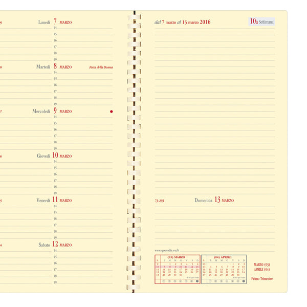 Agenda settimanale tascabile in formato verticale. Una settimana su due pagine. 13 mesi da dicembre a dicembre, pagina di sinistra da lunedì a sabato, pagina di destra domenica + appunti, informazioni pratiche e rubrica intercambiabile. Carta avorio certificata PEFC, stampa bicolore, rilegatura con spirale. Edizione italiana