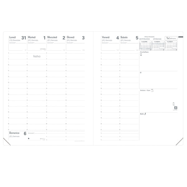 Agenda settimanale da ufficio, una settimana su due pagine. 13 mesi da dicembre a dicembre. Rubrica intercambiabile. Carta bianca certificata PEFC, stampa bicolore, rilegatura cucita. Edizione italiana.